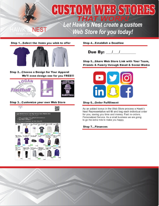 Custom Web Stores - Powered by Hawk's Nest lets your participants buy all the spirit wear they will need for the season in one convenient location. Every purchase puts money back into your organization. Hawk's Nest friendly team sales representatives will help you select and create the right assortment of products including all the major athletic brands.